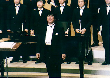 演奏終了後、作曲者の本間雅夫先生をご紹介する指揮者です。