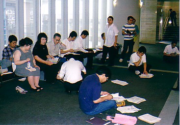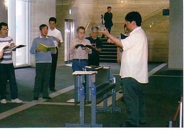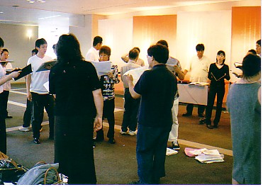 朝の練習の様子です。ステージが準備中のためロビーでの練習です。